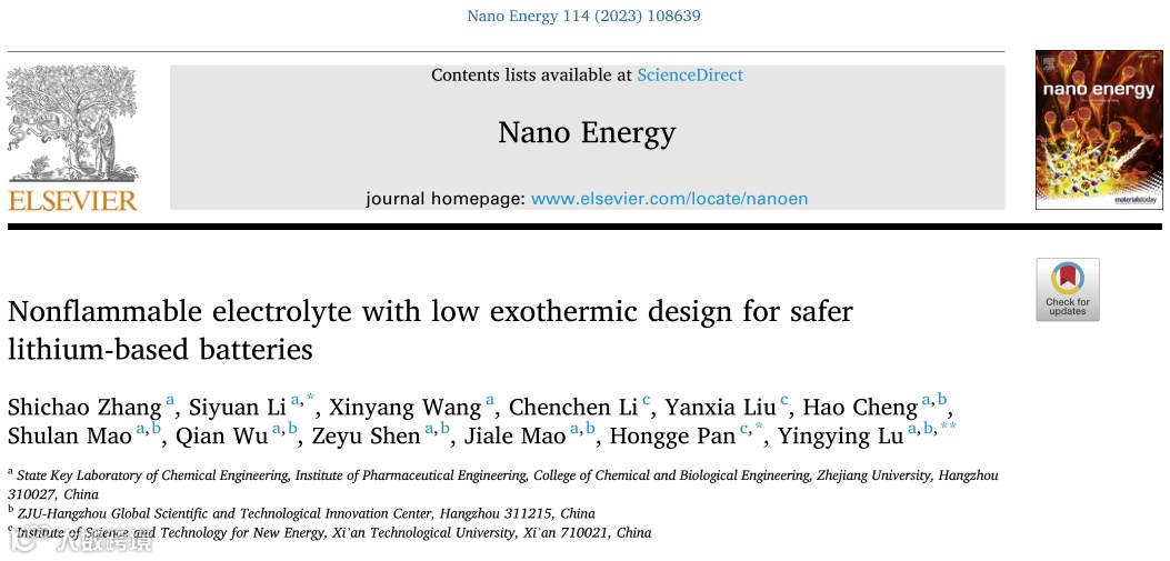 近日,来自浙江大学的陆盈盈教授、李思远博士和西安工业大学的潘洪革教授合作,在国际顶级期刊Nano Energy上发表题为“Nonflammable electrolyte with low exothermic design for safer lithium-based batteries”的研究工作。该文章探讨了多种溶剂与完全充电态的阴极的热释放,并总结了溶剂/热释放相图,在此基础上选择了双(2,2,2-三氟乙基)碳酸酯(TFEC)来制备一种不易燃、低放热的电解质。这种电解质将商业锂离子软包电池热失控过程中的最高温度的降低了三分之一,并将最大升温速率从206.0℃ s−1 降低到82.6℃ s−1 。此外,它还表现出与锂金属阳极的良好兼容性。受益于富含-CF3 有机层的均匀的固体电解质界面(SEI),Li||LiNi0.8Co0.1Mn0.1O2 (NCM811)全电池在240次循环后显示出80%的容量保持率。值得注意的是,在现实条件下,具有365 Wh kg−1 的高能量密度的1.5 Ah锂金属软包电池在98次循环后表现出90.02%的出色容量保持率。这项工作提供了一种崭新的方法,通过设计不易燃和低放热的电解质来构建更安全和更持久的锂基电池。