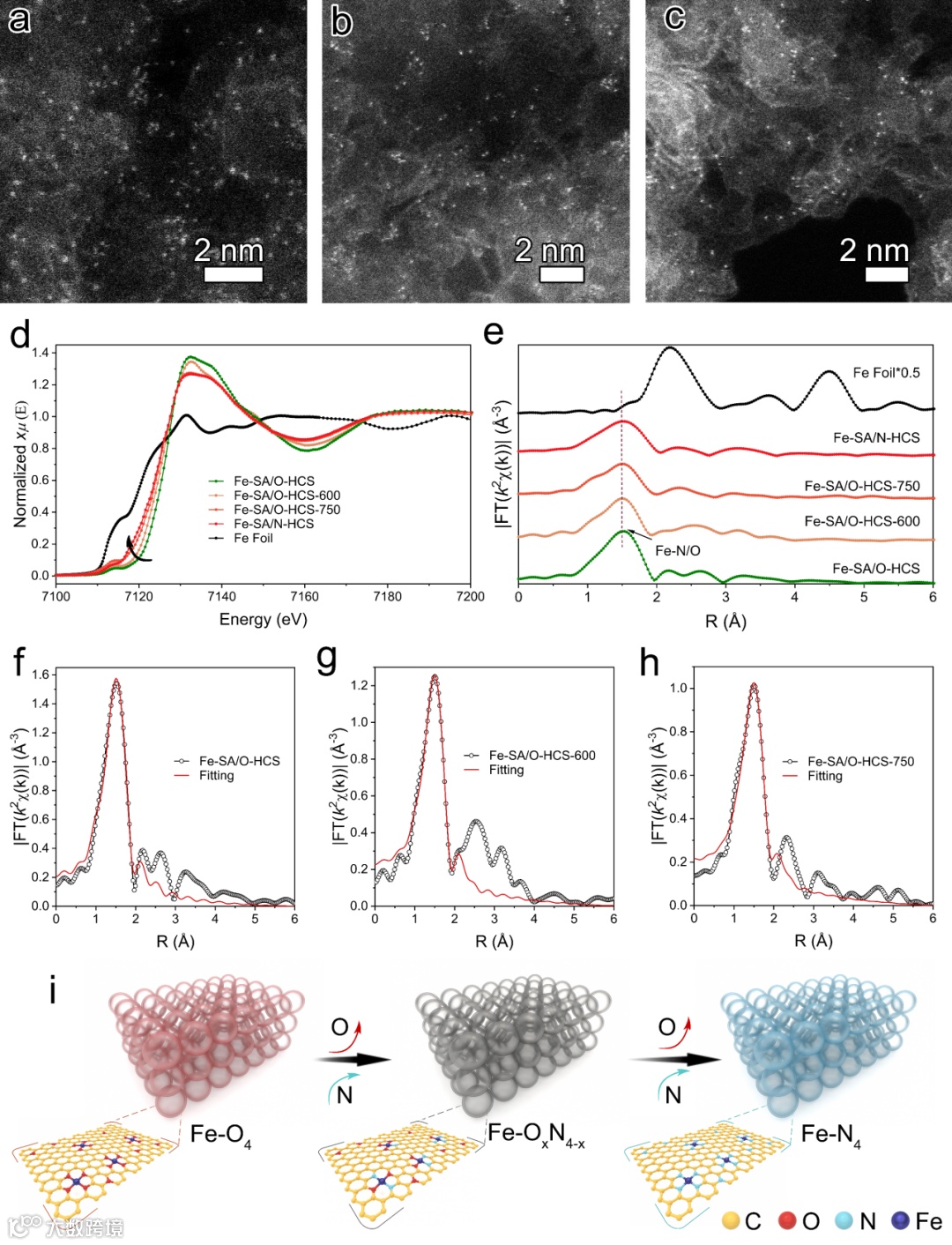 近日,来自青岛科技大学的王磊教授课题组等人,在国际知名期刊Angewandte Chemie-International Edition上发表题为“Constructing Fe-N4 Sites through Anion Exchange-mediated Transformation of Fe Coordination Environments in Hierarchical Carbon Support for Efficient Oxygen Reduction”的文章。该工作利用原位阴离子置换反应,不仅实现低活性Fe-O4向高活性Fe-N4活性中心的可控转变,而且还可以实现一系列具有不同微观配位环境单原子活性中心(Fe-OxN4-x)的精准调控。富含中空碳球的层状多孔结构、高活性位密度、高活性中心利用率的Fe-SA/N-HCS表现出优异ORR性能、水系和柔性可充放电锌-空电池性能。该工作为高活性、高稳定性单原子催化剂精准制备提供了重要参考。