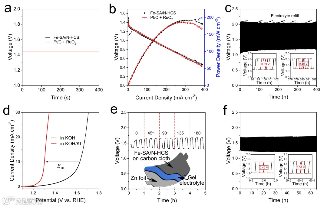 图3. 基于Fe-SA/N-HCS组装的锌-空气电池性能评估。