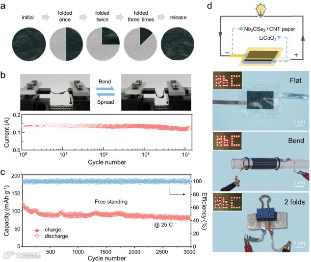 图4.(a)Nb2CSe2/CNTs柔性电极在不同折叠过程中的数码照片,(b)弯曲循环期间的稳定性测试,(c)Nb2CSe2/CNTs柔性电极在25 C下的循环性能,(d)LiCoO2||Nb2CSe2/CNTs柔性全电池的示意图和可行性测试。