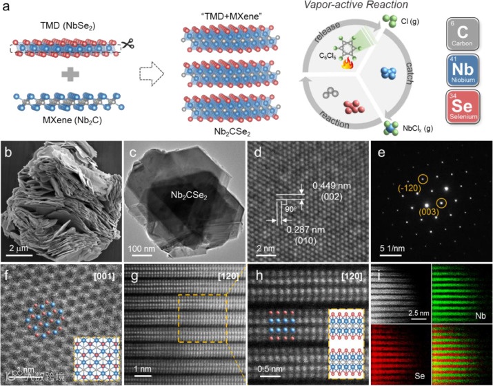 图1.(a)通过“气态-活化”法一步制备Nb2CSe2示意图,Nb2CSe2的(b)SEM、(c)TEM、(d)HRTEM和(e)SAED图像,(f)沿[001]方向和(g,h)沿[120]晶体方向的Nb2CSe2的HAADF原子图像,(i)[Se-Nb-C-Nb-Se]层的EDS元素图谱。