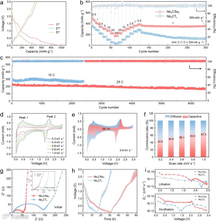 图3.(a)Nb2CSe2在前三个循环中的GCD曲线,(b)Nb2CSe2和Nb2CTx的倍率性能,(c) Nb2CSe2在10 C和25 C下的长循环稳定性,(d)Nb2CSe2在不同扫描速率下的CV曲线,(e)在0.6 mV s−1下电容贡献,(f)不同扫描速率下的赝电容贡献,(g)Nb2CSe2和Nb2CTx在初始阶段和10个循环后的Nyquist图,(h)Nb2CSe2和Nb2CTx的GITT对比,(i)Li+扩散系数对比。