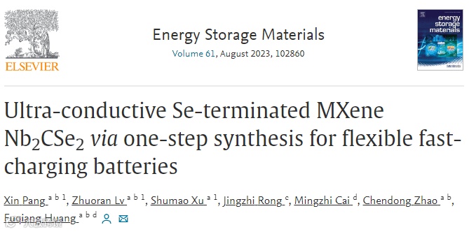 Xin Pang, Zhuoran Lv, Shumao Xu, Jingzhi Rong, Mingzhi Cai, Chendong Zhao, Fuqiang Huang*. Ultra-Conductive Se-Terminated MXene Nb2CSe2 via One-Step Synthesis for Flexible Fast-Charging Batteries. Energy Storage Materials, 2023, 61, 102860.