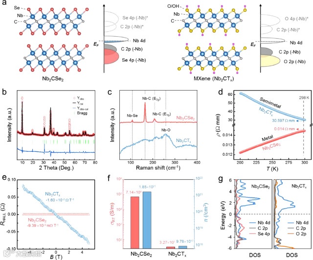 图2.(a)Nb2CSe2和传统MXene Nb2CTx的晶体和电子结构图,(b)Nb2CSe2的XRD图谱,Nb2CSe2和Nb2CTx的(c)拉曼光谱,(d)电阻率随温度变化曲线,(e)磁通密度(B)和霍尔电阻(RHALL)的相关性,(f)室温下的电导率(δRT)和载流子浓度(n),以及(g)DOS图。