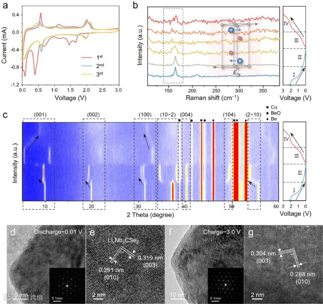图5.(a)Nb2CSe2在前三个循环中的CV曲线,Nb2CSe2在第一次循环中的(b)原位拉曼光谱和(c)原位XRD图谱,Nb2CSe2在最终放电状态下的(d,e)HRTEM图像和SEAD图像。Nb2CSe2在最终再充电状态下的非原位(f,g)HRTEM图像和SEAD图像。