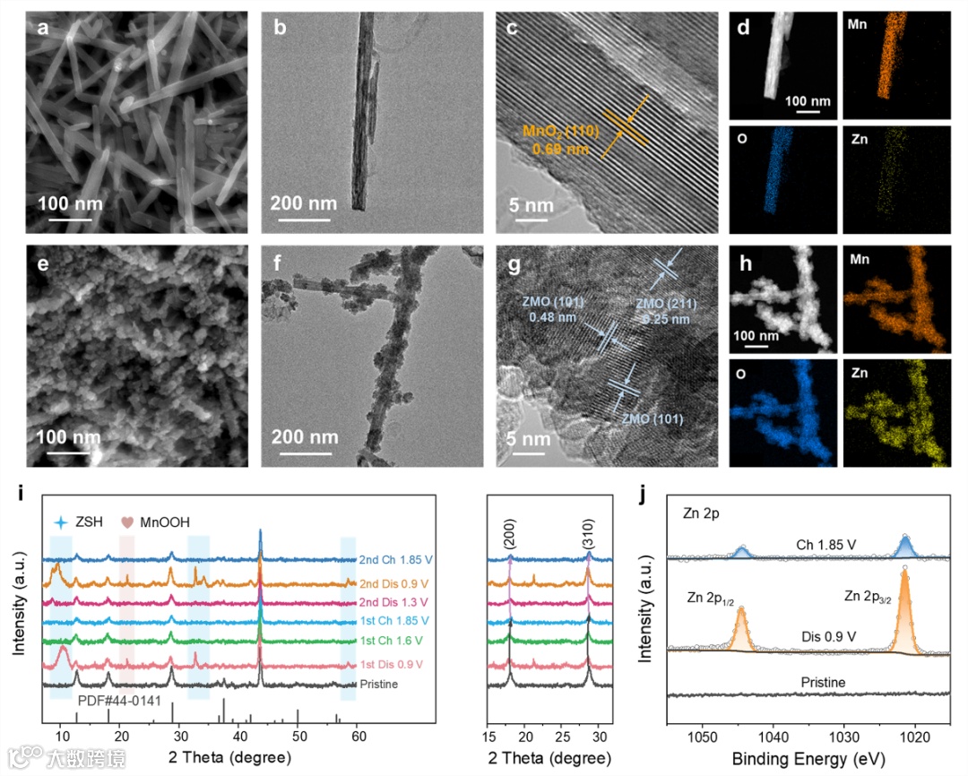 图6. (a-d)MnOF0.04和(e-h)MnO2电极在循环300圈后充电完全的结构表征,(i)MnOF0.04电极在不同充放电状态下的XRD图谱,(j)MnOF0.04电极在不同充放电状态下Zn 2p的XPS谱。