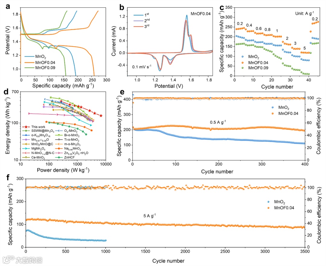 图4. (a)MnO2、MnOF0.04和MnOF0.09三种正极组装的水系锌离子电池在0.2 A g-1的电流密度下的恒电流充放电曲线,(b)MnOF0.04正极在0.1 mV s-1扫描速率下的前三圈的CV曲线,(c)MnO2、MnOF0.04和MnOF0.09三种正极组装的水系锌离子电池的倍率性能,(d)MnOF0.04 与其他工作报道的能量对比拉贡图,MnO2和MnOF0.04正极在(e)0.5 A g-1,(f)5 A g-1下的长循环性能。