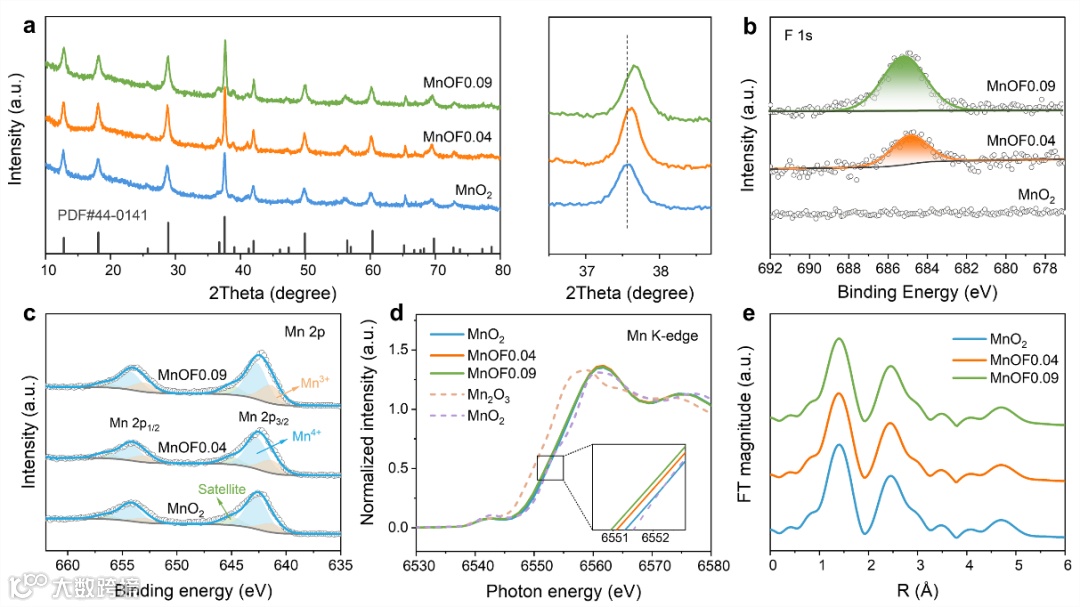 图3. (a)所制得样品MnO2、MnOF0.04和MnOF0.09的(a)XRD谱,(b) F 1s,(c)Mn 2p的XPS谱,(d)Mn K-edge的XANES谱,(e)FT-EXAFS谱。