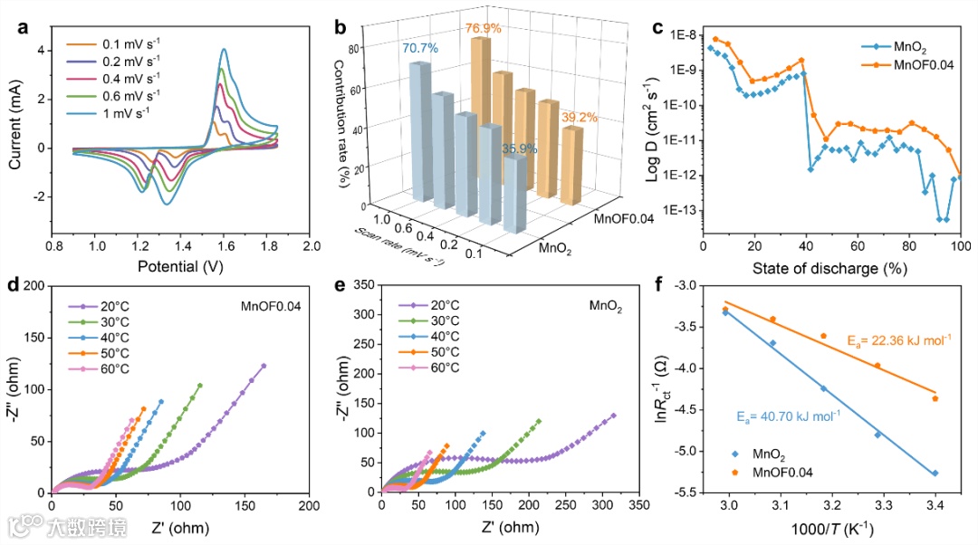 图5. (a)MnOF0.04在0.1-1 mV s-1的扫描速率下的CV曲线,(b)MnOF0.04和MnO2电极电容贡献比例,(c)GITT计算得到的Zn2+扩散系数,(d)MnOF0.04和(e)MnO2正极在不同温度下的Nyquist图,(f)MnOF0.04和MnO2电极的Arrhenius图。