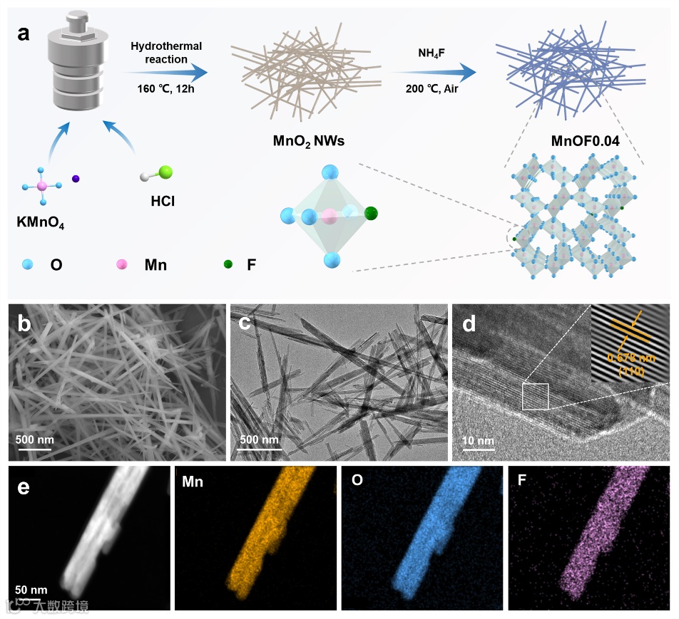 图2. (a)MnOF0.04合成过程示意图,MnOF0.04的(b)SEM图,(c)TEM图,(d)HRTEM,(e)HAADF-STEM及对应的元素分布图。