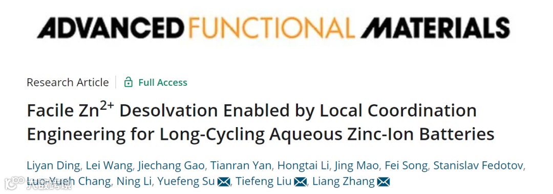 基于此,来自苏州大学的张亮教授、浙江工业大学的刘铁峰教授、北京理工大学的苏岳峰教授合作,在国际知名期刊Advanced Functional Materials上发表题为“Facile Zn2+ Desolvation Enabled by Local Coordination Engineering for Long-Cycling Aqueous Zinc-Ion Batteries”的文章。