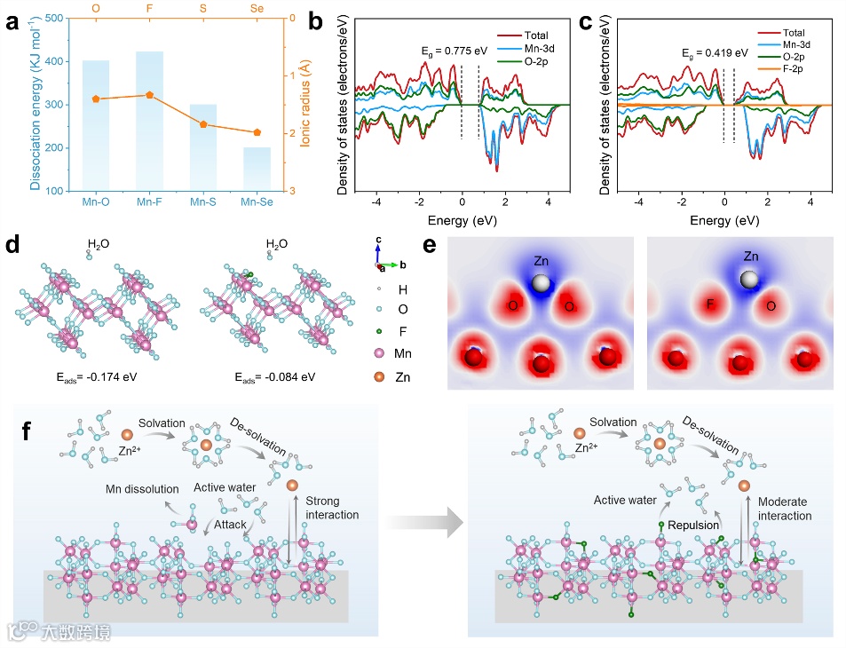 该工作首先通过理论计算证明F原子局部配位调控能够改善MnO2基底体相和界面性质,主要表现为: