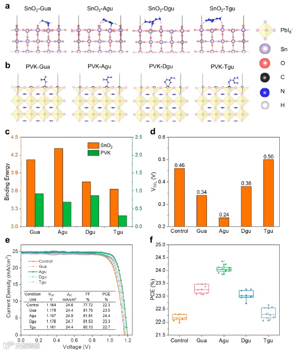 Figure 2. (a) DFT calculation models of Gua, Agu, Dgu, and Tgu on a SnO2 film. (b) DFT calculation models of Gua, Agu, Dgu, and Tgu on a perovskite film. (c) Corresponding binding energies calculated by DFT. (d) VTFL values of control and AGs-modified devices estimated by SCLC characterizations. (e) Representative J−V curves and (f) PCE statistical data of a control device and AGs-modified devices.