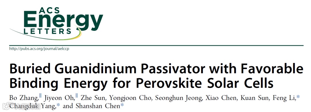 基于此,来自重庆大学陈珊珊副研究员、韩国蔚山科技大学Changduk Yang教授以及复旦大学的李峰教授合作,在国际知名期刊ACS Energy Letters上发表题为“Buried Guanidinium Passivator with Favorable Binding Energy for Perovskite Solar Cells”的文章。该文章通过设计一系列新型的胍盐酸盐修饰剂修饰埋底界面获得了24.4%的光电转换效率。