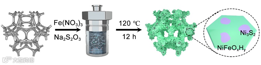 图1:Ni3S2/NiFeOxHy异质纳米片阵列的合成示意图。