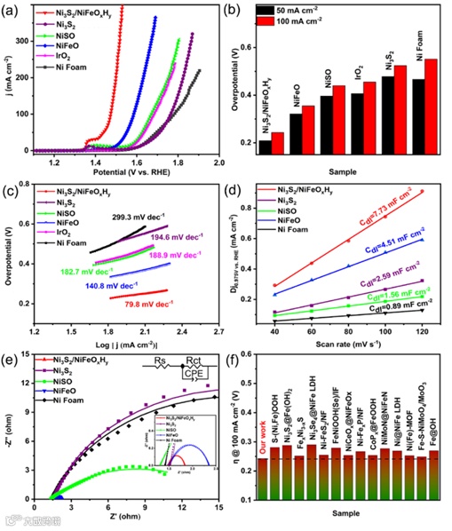 图3:Ni3S2/NiFeOxHy和其他对比催化剂在1 M KOH中的OER电化学测试结果。