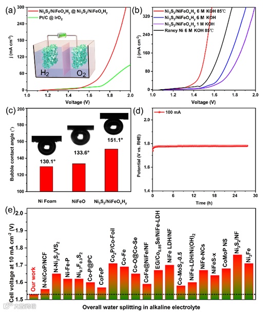 研究人员以Ni3S2/NiFeOxHy异质纳米片阵列电极为阴极和阳极组装的电解槽,在1 M KOH 电解液中驱动10 mA cm-2的全水解反应仅需要1.53 V的电压,全电解水性能优于商业贵金属Pt/C@IrO2/C。特别是,在模拟工业电解水条件下(85 ℃,6 M KOH电解液),所制备的Ni3S2/NiFeOxHy异质纳米片阵列电极仅需要1.32 V电压就可驱动10 mA cm-2的电流密度,全电解水性能远优于工业电解水常用的雷尼镍电极。得益于自支撑一体化的纳米片阵列结构,Ni3S2/NiFeOxHy电极在1 M KOH电解液100 mA cm-2高电流密度条件下,表现出优异的长期稳定性。