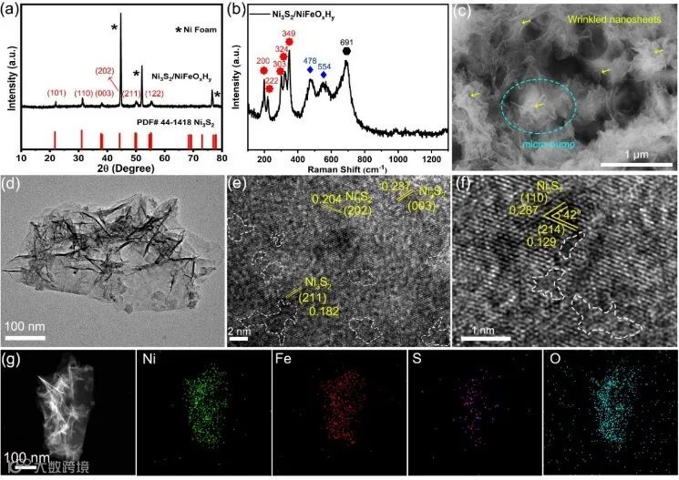 图2:Ni3S2/NiFeOxHy的XRD、Raman、SEM、TEM以及STEM表征。