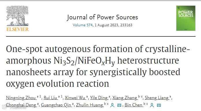 近日,来自中国科学院合肥物质科学研究院固体物理研究所陈斌研究员、黄竹林研究员和合肥学院能源材料与化工学院周宁宁老师合作,在国际知名期刊Journal of Power Sources上发表题为“One-spot autogenous formation of crystalline-amorphous Ni3S2/NiFeOxHy heterostructure nanosheets array for synergistically boosted oxygen evolution reaction”的研究论文。