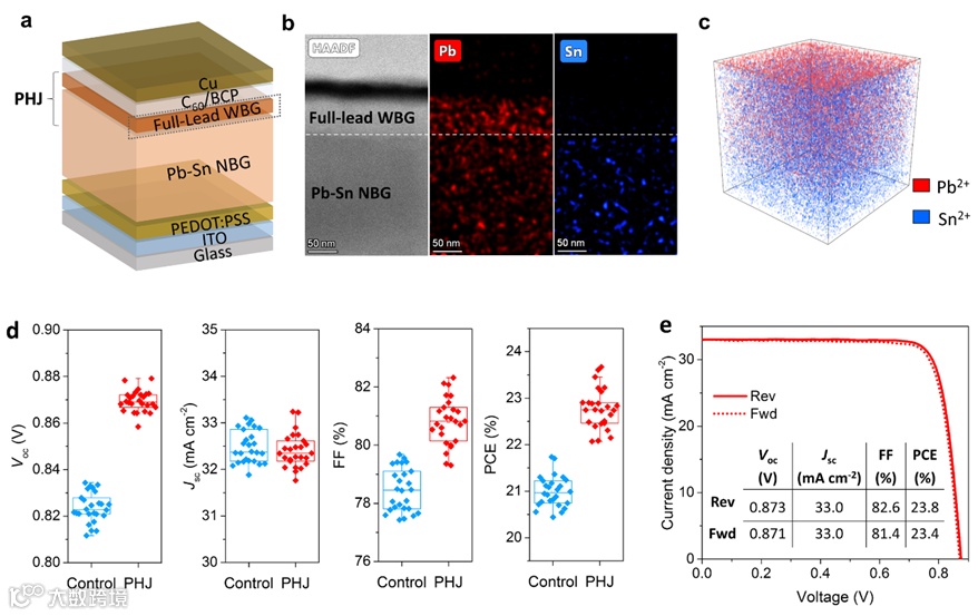 为解决上述瓶颈,本研究设计了新型的3D/3D双层钙钛矿异质结(PHJ)结构:利用真空蒸发和溶液加工混合法,在铅-锡混合窄带隙钙钛矿薄膜上生长一层数十纳米厚的三维纯铅宽带隙钙钛矿薄膜(FL-WBG)(见图1 a-c)。通过调控三维纯铅宽带隙钙钛矿的组分,使其与窄带隙钙钛矿形成Type-II型异质结结构,促进载流子(电子)从钙钛矿吸光层向电子传输层抽取,降低钙钛矿/电子传输层C60之间的界面复合损失,显著提升了电池的开路电压、填充因子和光电转换效率(图1 d),最佳性能的窄带隙钙钛矿电池光电转换效率达到了23.8%(图1 e),为目前报道的最高效率。