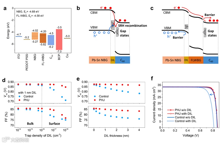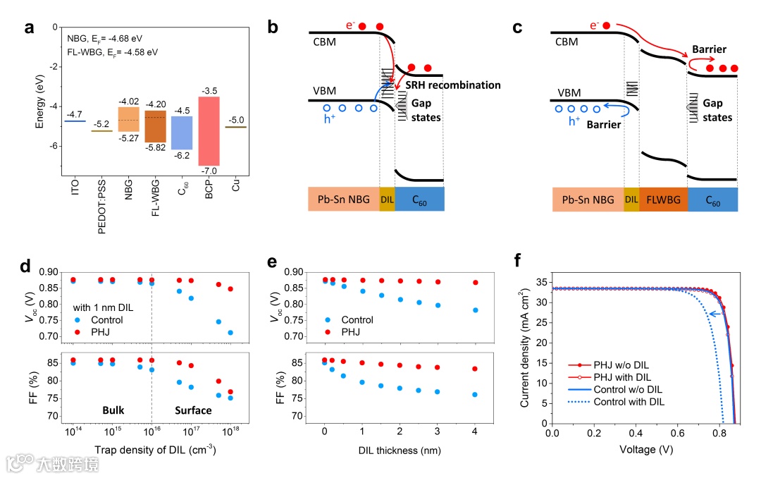 使用紫外光电子能谱(UPS)测量的不同钙钛矿的能级显示:精细调控的FL-WBG钙钛矿与铅锡钙钛矿形成Type-II型能带异质结结构(见图 2a-c)。经过费米能级平衡和能带弯曲后,具有PHJ结构的铅锡钙钛矿能带向下弯曲,这驱使空穴能够远离(见图2 c 蓝线)铅锡钙钛矿表面的缺陷层(DIL),并加速电子向电子传输层(C60)的漂移 (见图2c 红线),从而减少了载流子在缺陷层处的非辐射复合(见图2 b 红线和蓝线)。