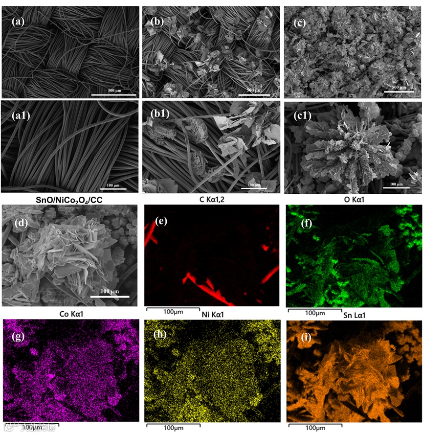 图2. (a, a1) CC、(b, b1) SnO/CC和(c, c1) SnO/NiCo2O4/CC电极的SEM图像。(d-i) SnO/NiCo2O4/CC电极的能量色散光谱仪(EDS)图。