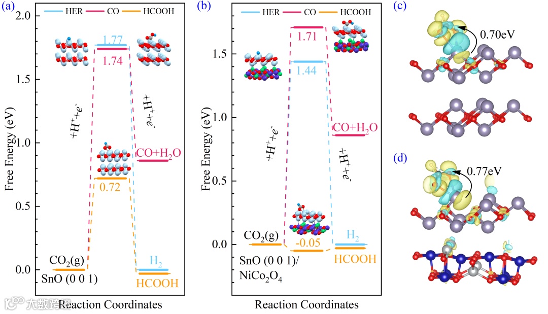 图8. (a)SnO(001)和(b)SnO(001)/NiCo2O4表面CO2还原为HCOOH、CO和H2的自由能图。(c)SnO(001)和(d)SnO(001)/NiCo2O4表面上还原CO2的电子转移。(蓝色和粉色分别指的是电子积累和耗竭区。等效表面值为0.05 e/au)