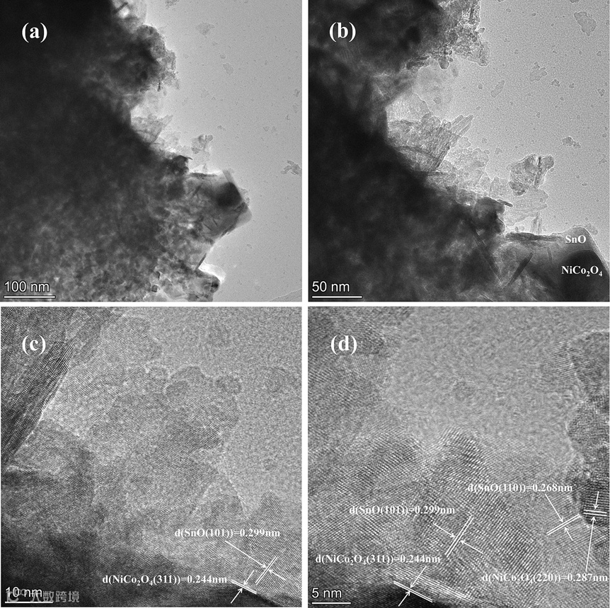 图4. (a-b)TEM和(c-d)HRTEM的SnO/NiCo2O4/CC图像。
