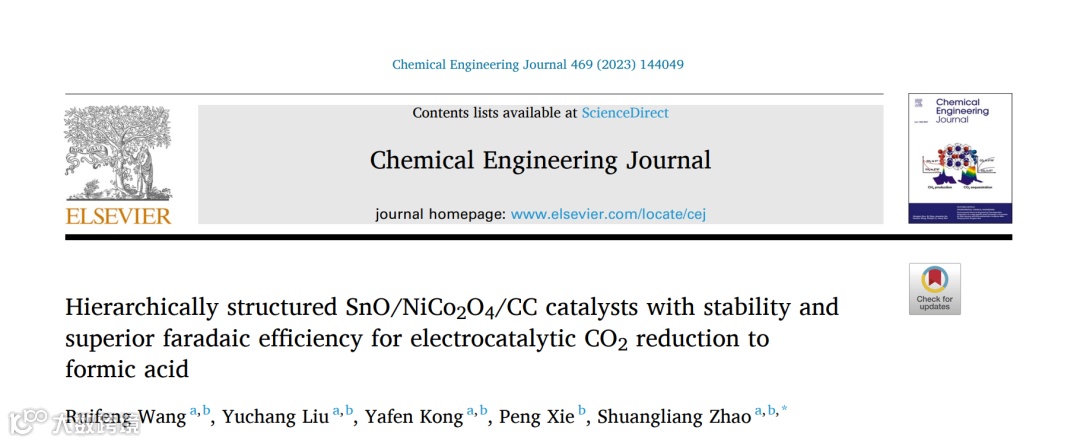 近日,广西大学赵双良教授团队在国际知名期刊Chemical Engineering Journal上发表题为“Hierarchically Structured SnO/NiCo2O4/CC Catalysts with Stability and Superier Faradaic Efficiency for Electrocatalytic CO2 Reduction to Formic Acid”的研究。该研究在CO2电催化转化为有用化学品研究方面的取得了最新进展。