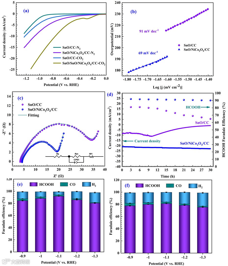 图6. (a)LSV和(b)Tafel图(c)SnO/CC和SnO/NiCo2O4/CC电极的EIS,插图:等效电路。(d) SnO/NiCo2O4/CC电极在-1.1V时的长期稳定性(V vs. RHE)。(e) SnO/NiCo2O4/CC、(f) SnO/CC电极上在不同电位下产生的HCOOH, CO和H2的法拉第效率。