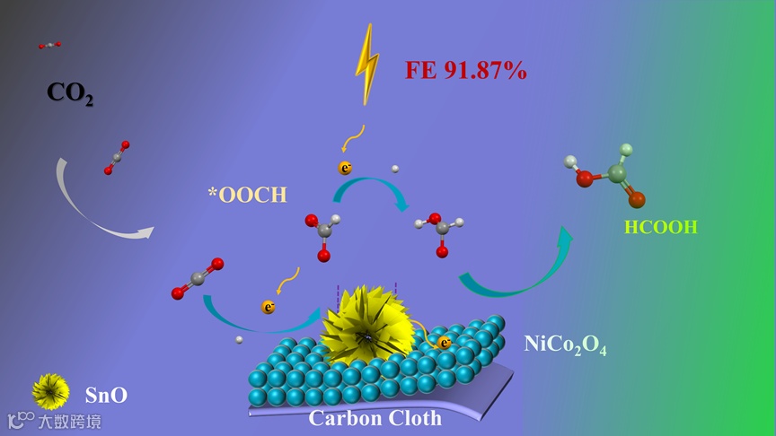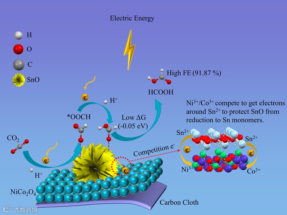 图1. SnO/NiCo2O4/CC催化剂电催化还原CO2至HCOOH的反应过程。