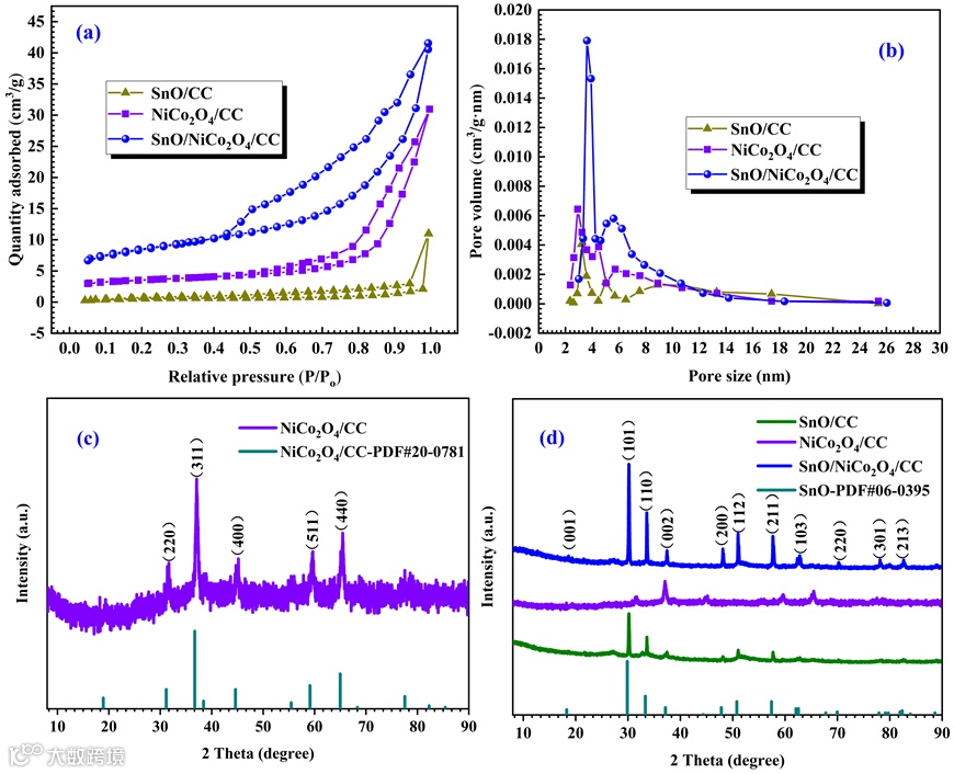 图3. (a)SnO/CC、NiCo2O4/CC和SnO/NiCo2O4/CC电极的N2吸附-解吸等温线和(b)孔隙大小分布。(c) NiCo2O4/CC、(d) SnO/CC和SnO/NiCo2O4/CC电极的XRD图。