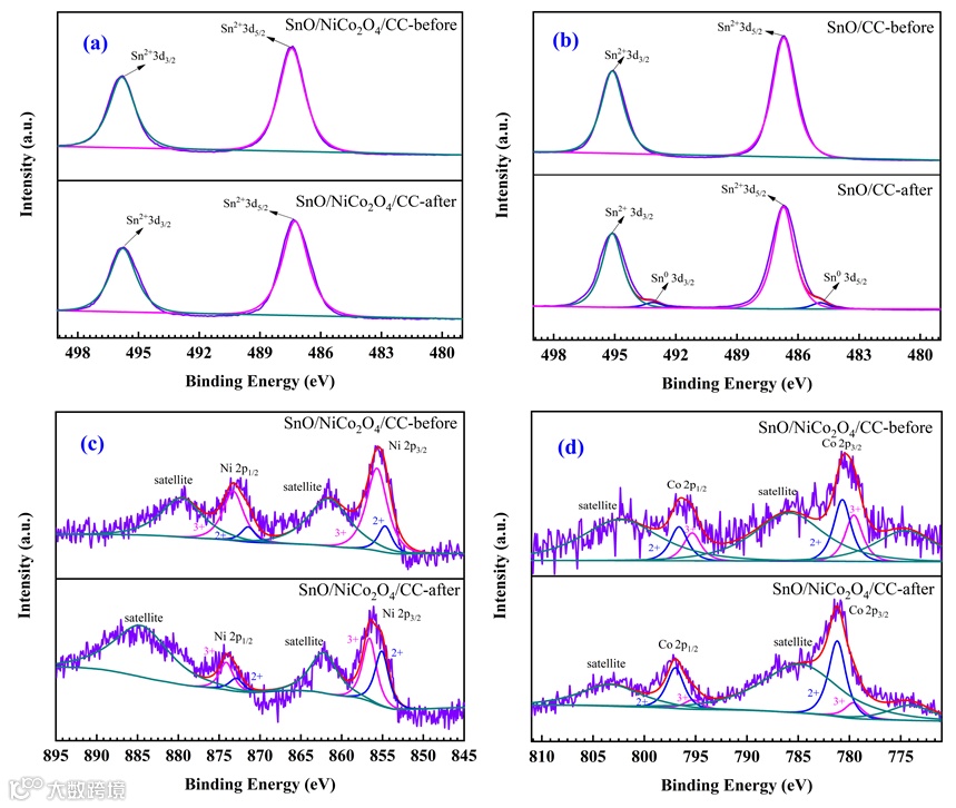 图5. (a)SnO/NiCo2O4/CC和(b)SnO/CC电极催化还原前后的高分辨XPS Sn 3d光谱。SnO/NiCo2O4/CC电极催化还原前后的高分辨XPS(c)Ni 2p和(d)Co 2p光谱。