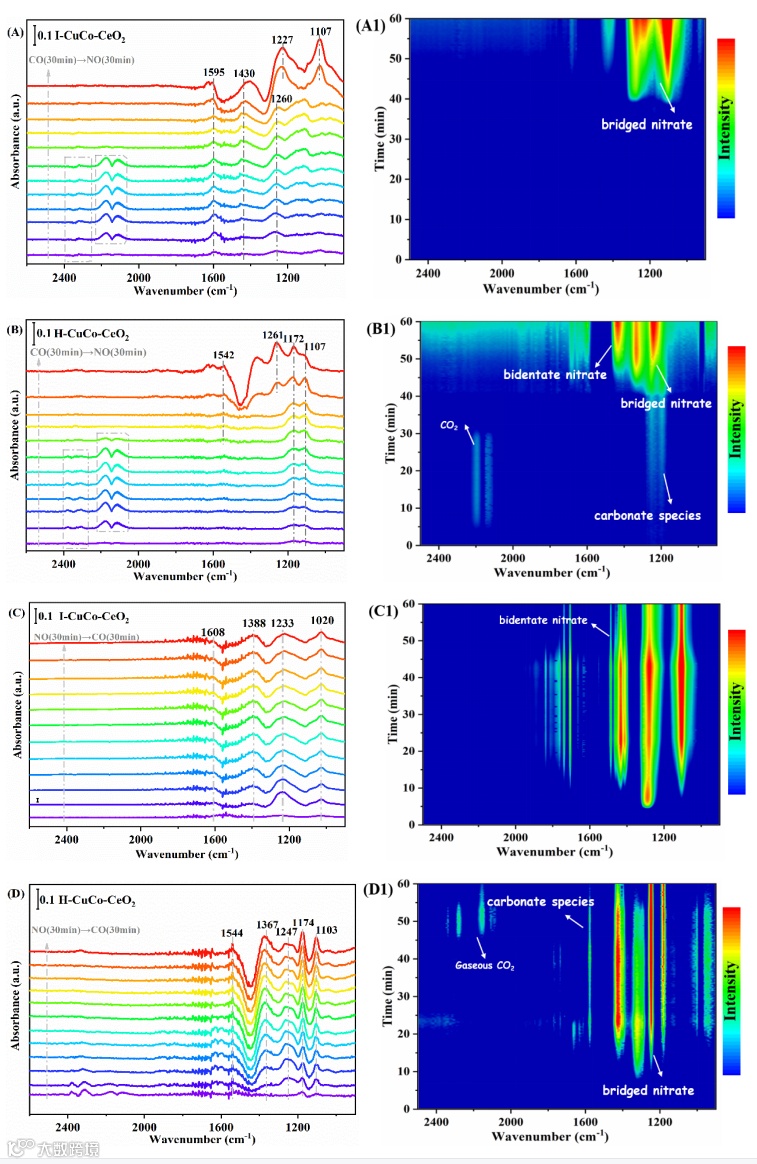 原位红外瞬态吸收光谱研究了H-CuCo-CeO2与I-CuCo-CeO2在反应过程中的反应机理。相较于I-CuCo-CeO2催化剂,H-CuCo-CeO2构建了暴露量更大,还原能力更高的CO吸附活性位点,有效的提高CO选择性催化还原NO的催化活性。根据上述反应结果发现,NO和CO在H-CuCo-CeO2发生竞争性吸附,NO优先吸附在催化剂表面的一些金属阳离子上,占据部分活性位点,从而抑制了CO在催化剂表面的吸附。
