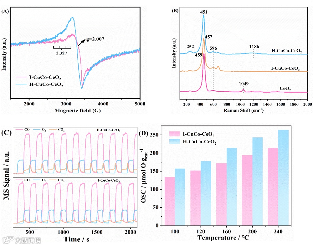 图4. 催化剂的EPR(A)、Raman(B)、OSC测试中在线MS监测到的CO、O2和CO2的信号(C)和在不同温度下的OSC值(D)