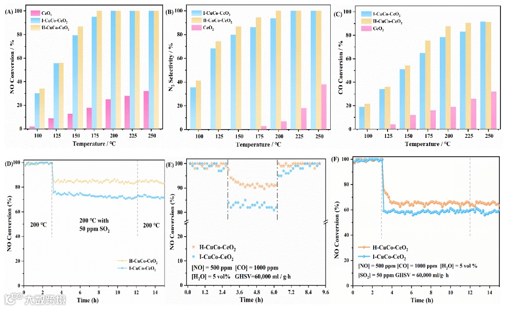 CuCoO2-CeO2所构成的异质界面在CO-SCR中表现出优异的催化活性。其中,采用原位水热法制备的H-CuCo-CeO2催化剂在175℃的脱硝率和氮气选择性分别为100%和92%,高于绝大多数传统的复合金属催化剂,说明调控催化剂的结构可以有效的促进CO选择性催化还原NO的催化活性。此外,H-CuCo-CeO2催化剂具有优异的抗H2O,SO2中毒性能。