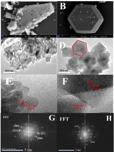 图2 催化剂的SEM、TEM、HRTEM和FFT图像(A, C, E, G)为I-CuCo-CeO2,(B, D, F, H)为H-CuCo-CeO2
