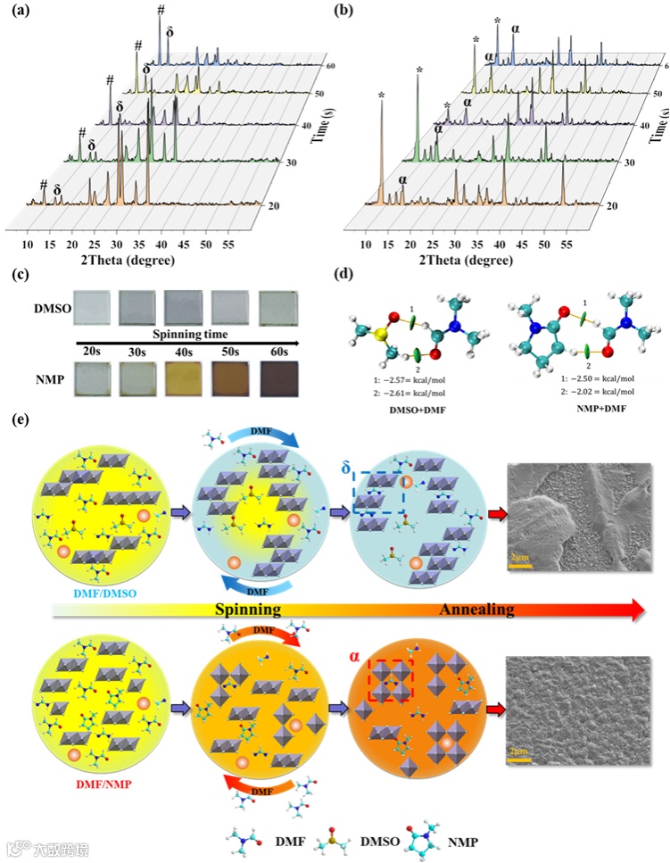 结果显示,具有更弱溶剂间相互作用的NMP/DMF体系,其所制备的钙钛矿薄膜结晶质量明显好于DMF/DMSO体系。在DMF/DMSO体系中,[PbI6]4-胶粒聚集且主溶剂DMF在旋涂过程中由于与DMSO间较强的氢键作用无法去除干净,这导致δ相的生成且薄膜后退火后出现孔洞,从而严重影响PSCs的性能和稳定性。而在DMF/NMP体系中,由于NMP与主溶剂将较弱的相互作用,可以快速逃逸从而在湿膜中形成所需的α相晶核,从而实现更好的结晶。