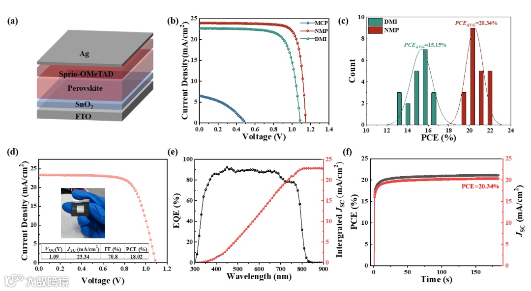 Figure 3. (a) Schematic diagram of the planar n-i-p structure perovskite solar cells. (b) J-V curves of champion performance PSCs fabricated from different solvents. (c) Statistics of efficiencies for the devices fabricated from DMF/NMP and DMF/DMI. (d) J-V curves of champion performance PSC in 1cm2 active area fabricated from DMF/NMP system. (e) EQE spectra of PSCs based on DMF/NMP solvent system. (f) Steady-state photocurrent for DMF/NMP devices at the maximum power point under AM 1.5G illumination.