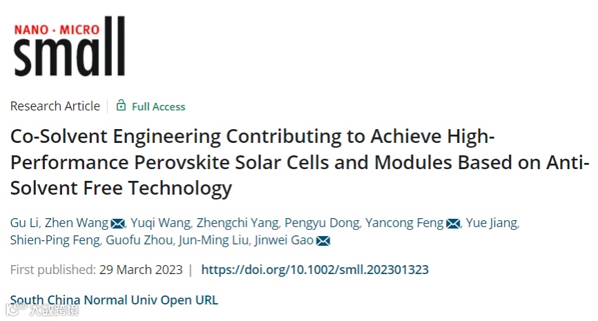 基于钙钛矿制备过程中存在的普遍问题,华南师范大学高进伟教授及王祯和冯炎聪副研究员于国际权威学术期刊《Small》发表题为“Co-Solvent Engineering Contributing to Achieve High-Performance Perovskite Solar Cells and Modules Based on Anti-Solvent Free Technology”的文章。