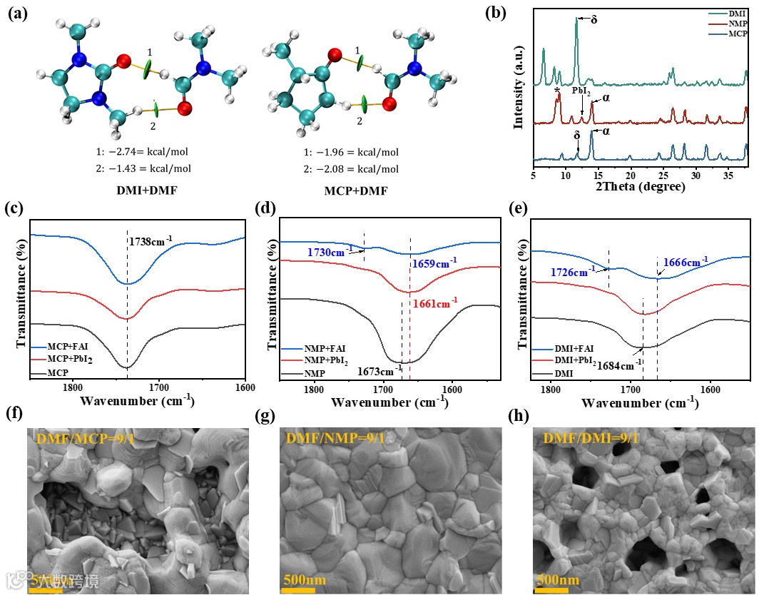 Figure 2. (a) DFT calculation of interaction between DMF and different solvents (MCP and DMI). (b) XRD spectra of three kinds of wet films (DMF/MCP, DMF/NMP, DMF/DMI) after spinning process (c) FTIR spectra of MCP, MCP mixed with PbI2, MCP mixed with FAI and (d) NMP, NMP mixed with PbI2, NMP mixed with FAI, (e) DMI, DMI mixed with PbI2, DMI mixed with FAI. (f-h) SEM images of three kinds of perovskite films made by different solvent systems after annealing.