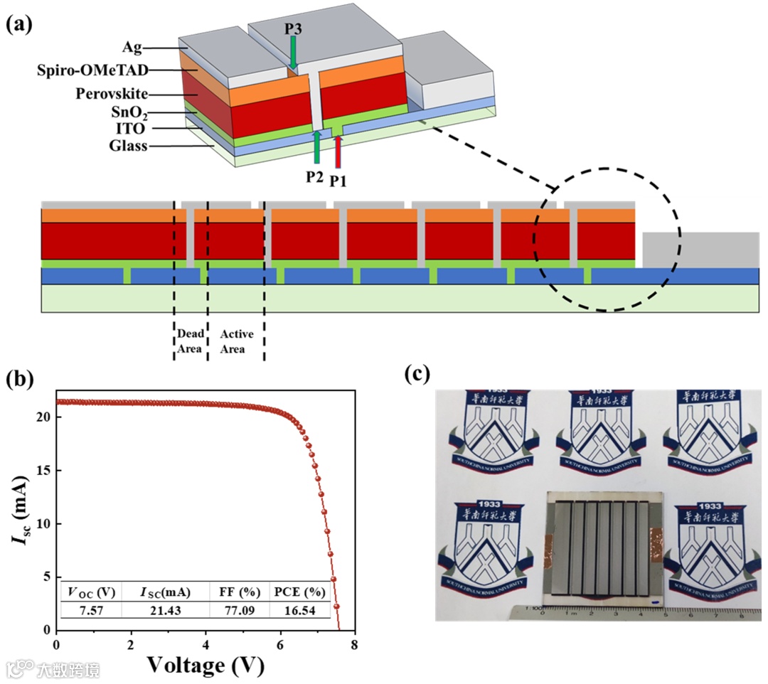 Figure 4. (a) Schematic diagram of 5×5 perovskite mini-module fabricated from anti-solvent free strategy. (b) Champion J-V curves of module fabricated from DMF/NMP. (c) Photograph of 5×5 cm2 mini-module.