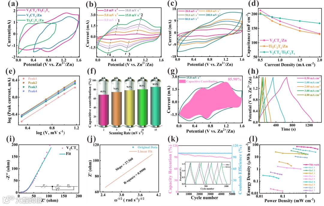 Figure 3. Electrochemical performances of V2CTx/Ti3C2Tx ZIHMSCs. (a) CV curves of the V2CTx/Zn, Ti3C2Tx/Zn, and V2CTx/Ti3C2Tx (V2CTx as the cathode and Ti3C2Tx as the anode) based ZIHMSCs in separate potential windows at a scan rate of 10.0 mV s−1. (b, c) The CV curves of ZIHMSCs at various scan rates from 2.0 to 200.0 mV s−1. (d) The area capacitance of the V2CTx/Zn, Ti3C2Tx/Zn, and V2CTx/Ti3C2Tx based ZIHMSCs with current density from 0.50 to 2.00 mA cm-2. (e) b values of four peaks in CV curves of (c). (f) Contribution ratio of capacitive storage of ZIHMSCs at different scan rates from 2.0 to 15.0 mV s−1. (g) The specific capacitive contribution of V2CTx cathode at 15.0 mV s-1. (h) GCD curves of ZIHMSCs at current densities from 0.50 to 4.00 mA cm-2. (i) Nyquist plot of ZIHMSCs in PAM hydrogel electrolyte containing 2.0 M ZnSO4. (j) Linear behavior of the real impedance (Z’) and ω −1/2 in the Warburg frequency region. (k) Cycling performance and coulombic efficiency of ZIHMSCs at a current density of 3.0 mA cm-2. (l) Ragone plots of the ZIHMSCs.