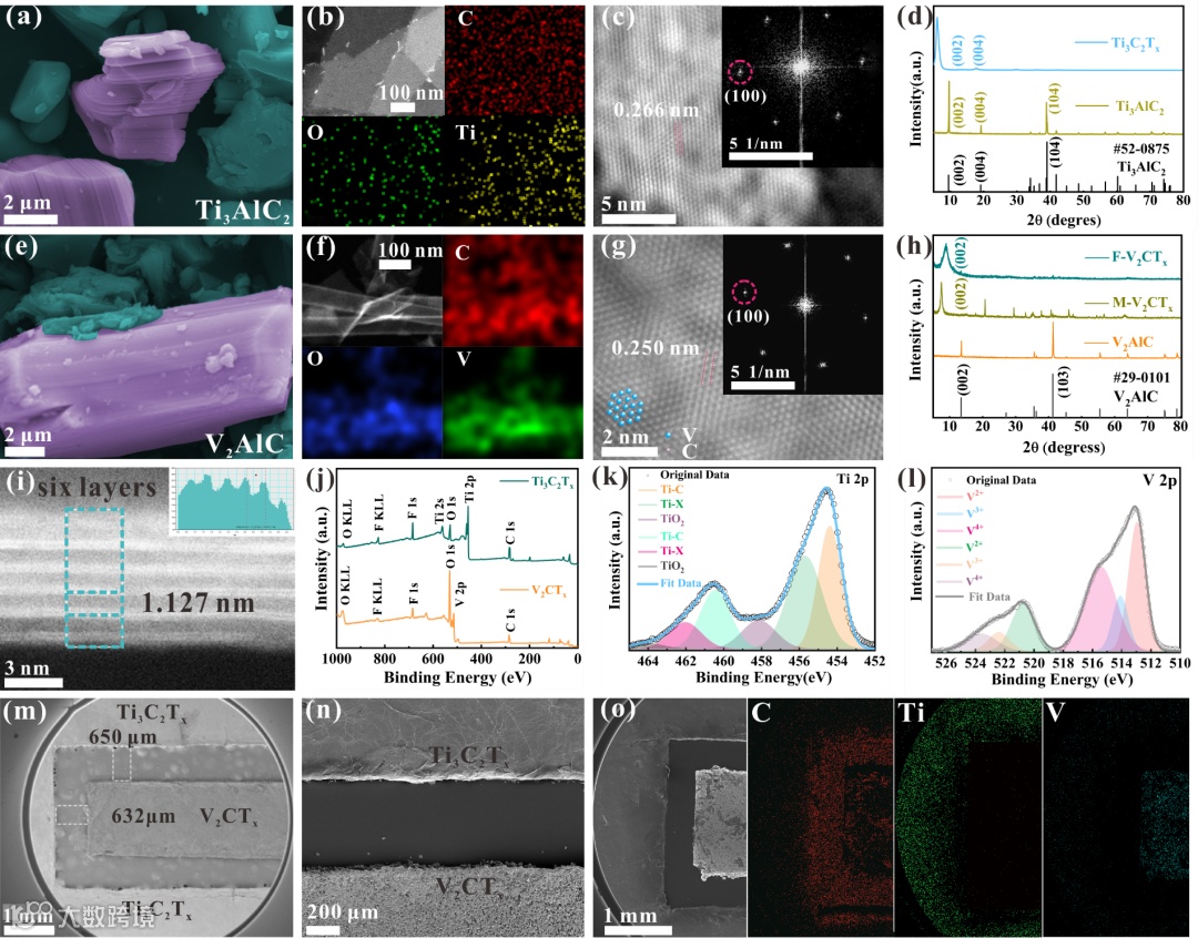 Figure 2. The morphology and composition characterization of the active materials and the electrodes. SEM images of (a) Ti3AlC2 and (e) V2AlC precursors. TEM images and corresponding elemental mappings of (b) Ti3C2Tx and (f) V2CTx. High-angle annular dark-field (HAADF) images for (c) Ti3C2Tx and (g) V2CTx and the insets show their corresponding FFT spots. (d) XRD patterns of Ti3C2Tx powder and Ti3C2Tx film. (h) XRD patterns of V2AlC, M-V2CTx (Multi-Layer V2CTx, and F-V2CTx (Few-layer V2CTx). (i) HRTEM image of F-V2CTx. (j) The overall XPS spectra of S-Ti3C2Tx (Single layer) and F-V2CTx. (k) Ti 2p spectrum of Ti3C2Tx and (l) V 2p spectrum of F-V2CTx. (m) The SEM image of the interdigital electrodes of the ZIHMSC. (n) The SEM image of the F-V2CTx-based cathode and Ti3C2Tx-based anode. (o) The SEM image and corresponding elemental mappings of the ZIHMSC.