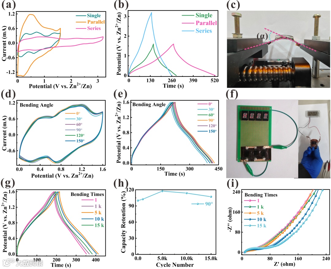 Figure 5. Flexibility and bending cycle performance of the ZIHMSCs. (a) CV curves at 10.0 mV s-1 and (b) GCD curves at 2.00 mA cm-2 of the ZIHMSCs in series and parallel connections. (c) Digital image of the bending test of the device, where the bending angle ɑ is defined as the two dotted lines. The CV curves at 10.0 mV s-1 (d) and (e) GCD curves at 1.00 mA cm-2 under the bending angle from 0° to 150°. (f) Optical photos of the digital tubes and the digital watch driven by the ZIHMSCs. (g) GCD curves of the ZIHMSCs under different bending cycles. (h) The calculated capacity retention of the ZIHMSCs under different bending cycles based on the GCD curves. (i) The Nyquist plots of ZIHMSCs corresponding to Figure 5 (g).