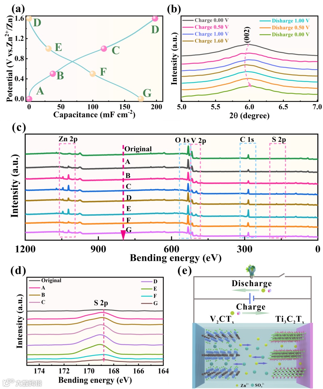 离位的XPS和XRD揭示了ZIHMSC的储能机理(图4a-d)。在充电过程中,S2p峰的强度逐渐增加;相反,S2p峰的强度随着放电的进行而降低,表面SO42-在V2CTx表面快速的吸附与解吸附过程。在充电过程中,来自外部电路的电子到达Ti3C2Tx,来自电解质的Zn2+迁移到Ti3C2Tx表面并进一步嵌入到Ti3C2Tx层中,而SO42-从电解质迁移并吸附到V2CTx表面;在放电过程中,会发生相反的反应(图4e)。