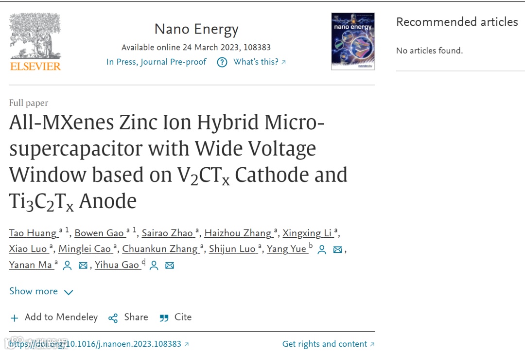 基于此,湖北汽车工业学院马亚楠副教授课题组&安徽大学岳阳副教授&华中科技大学高义华教授,在国际纳米领域顶级期刊Nano Energy上发表题为“All-MXenes Zinc Ion Hybrid Micro-supercapacitor with Wide Voltage Window based on V2CTx Cathode and Ti3C2Tx Anode”的研究论文。