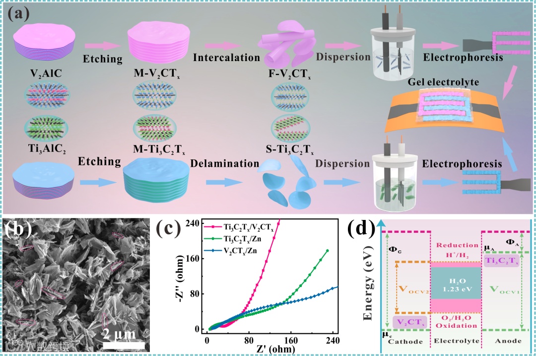 Figure 1. The fabrication procedure of the MXene-based ZIHMSCs and the mechanism for the high working voltage window. (a) The fabrication procedure of the MXene-based ZIHMSCs including the preparation of cathode electrodes and anode electrodes by the electrophoresis method. (b) SEM image of F-V2CTx-based cathode. (c) Nyquist plots of three different types of ZIHMSCs after the electrochemical activation. (d) Schematic diagram of the voltage window of the electrodes in aqueous electrolytes.