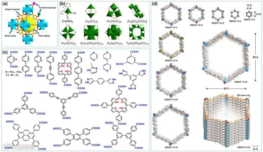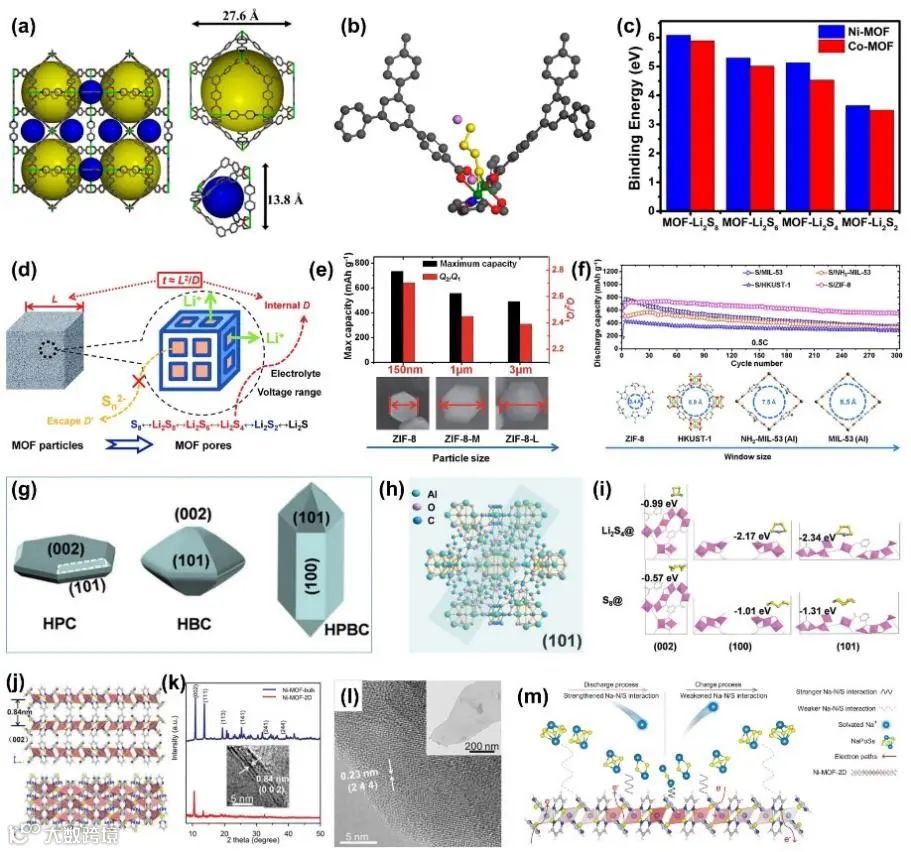 MOFs是通过将金属中心(金属离子或团簇)与有机配体连接起来构建的,这种构型使得MOFs的结构单元中出现孔隙空间,并且通过周期性组合进一步形成多孔结构,促使MOFs的比表面积高达1000-10000 m2 g-1。与其他多孔材料相比,MOFs的独特之处在于孔结构的可调性。由于MOFs的结构是由金属节点的几何形状和有机连接体的形状尺寸决定的,因此不同金属节点和有机连接体的选择使MOFs在一定程度上具有所需的孔径和结构。对于MCBs,多孔结构和较大的比表面积有利于MOFs作为电极活性材料的宿主;金属节点可以通过化学键吸附中间体,并提供丰富的极性催化位点来抑制穿梭效应并加速反应动力学。