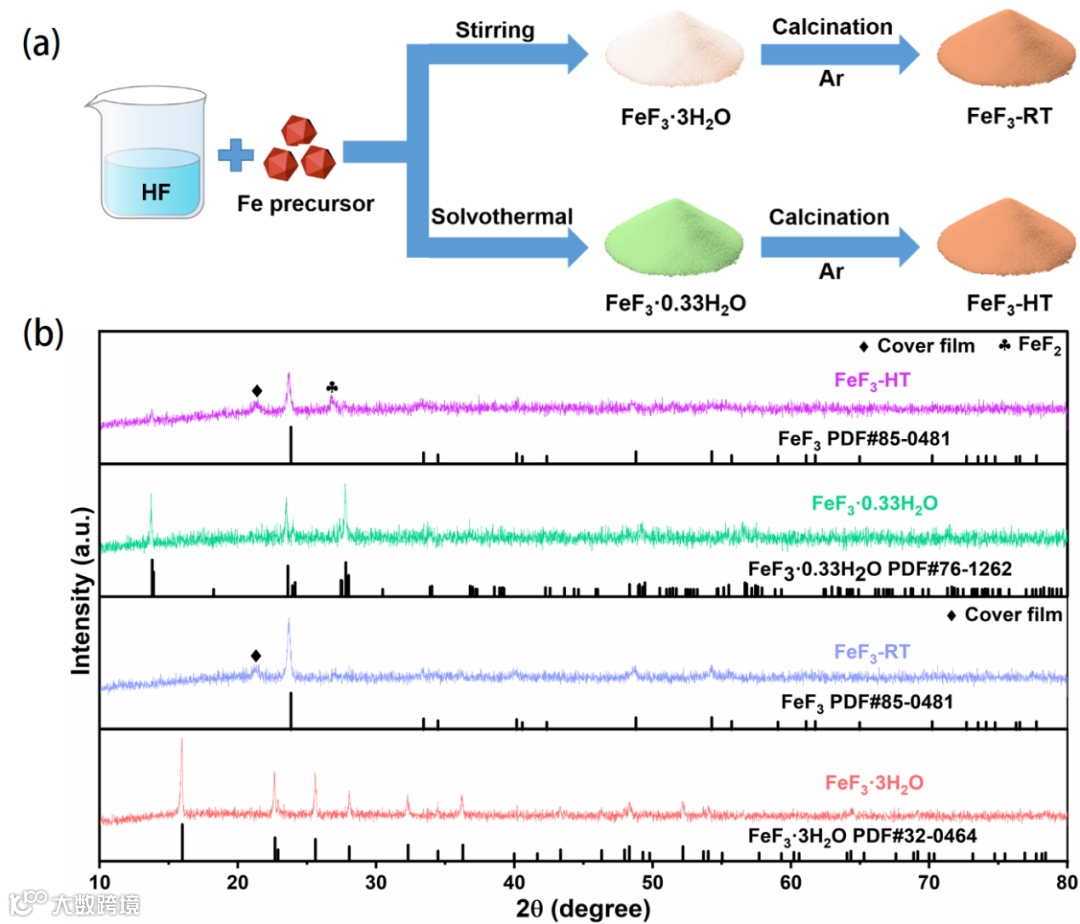图1 (a)不同结晶水含量的氟化铁材料的制备过程示意图。(b)不同结晶水含量的氟化铁材料的XRD图。